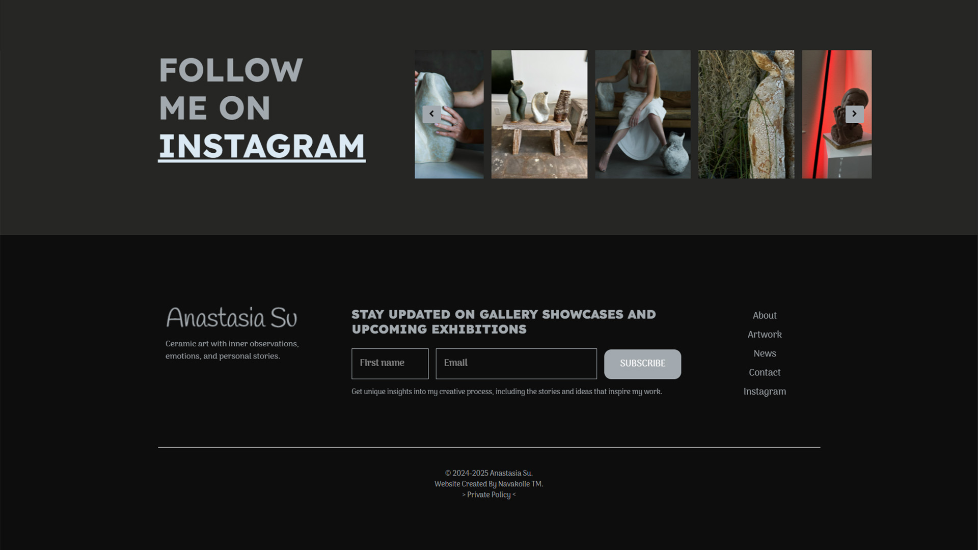 Проект включал создание минималистичного и удобного сайта с индивидуальным дизайном и структурой. Который рассказывает историю Anastasia Su и её пути до создания уникальной керамики ручной работы. Сайт также включает каталог с работами, которые можно просмотреть и заказать с помощью формы обратной связи на сайте. Новости, где можно узнать больше про керамические работы и их создательницу. Под каждый вид керамической работы были сделаны реальные фотографии с небольшой обработкой в фоторедакторе. А дизайн и цвета сайта были подобраны и сделаны исходя из предпочтений заказчицы.